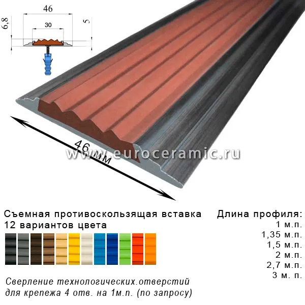1. Алюминиевой пластины с углублением для резиновой противоскользящей вставки. При правильном креплении профиль против скольжения плотно прилегает к поверхности ступени или пола.
