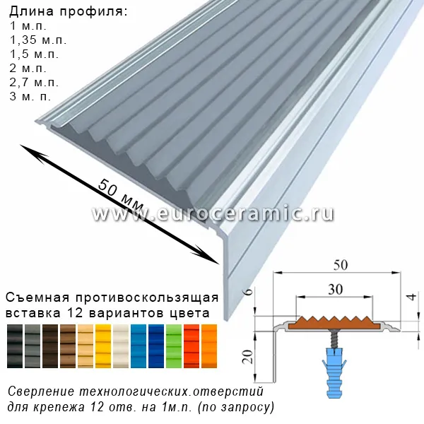 АУ50 Премиум противоскользящий алюминиевый угол-порог представляет собой усиленную угловую алюминиевую накладку для края ступени с антискользящей резиновой или ФЭС вставкой в комплекте. Профиль АУ50 Премиум используется для защиты от падений на ступенях на улице и дома, а также для защиты края ступени от сколов, если ступень отделана плиткой.
