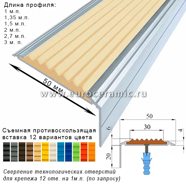 АУ50 Премиум противоскользящий алюминиевый угол-порог представляет собой усиленную угловую алюминиевую накладку для края ступени с антискользящей резиновой или ФЭС вставкой в комплекте. Профиль АУ50 Премиум используется для защиты от падений на ступенях на улице и дома, а также для защиты края ступени от сколов, если ступень отделана плиткой.