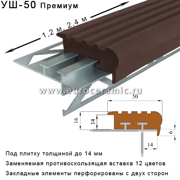 Алюминиевый закладной профиль УШ 50 Премиум с 2 закладными перфорированными элементами крепится на плиточный клей. Каркас профиля из алюминия, вставка - мягкий эластопласт. Длина алюминиевого каркаса: 1,2 м.п. и 2,4 м.п.